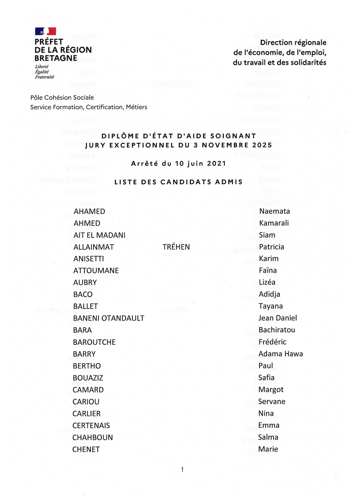 Diplôme d’Etat d’Aide-Soignant : Liste candidats admis jury exceptionnel 3 novembre 2025